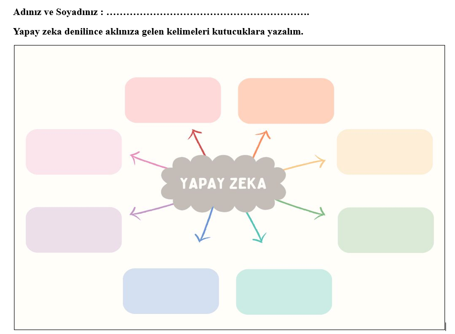 Hadi aşağıdaki çalışma kağıdını indirelim ve “Yapay Zeka” denilince aklımıza gelenleri kutucuklara yazalım.