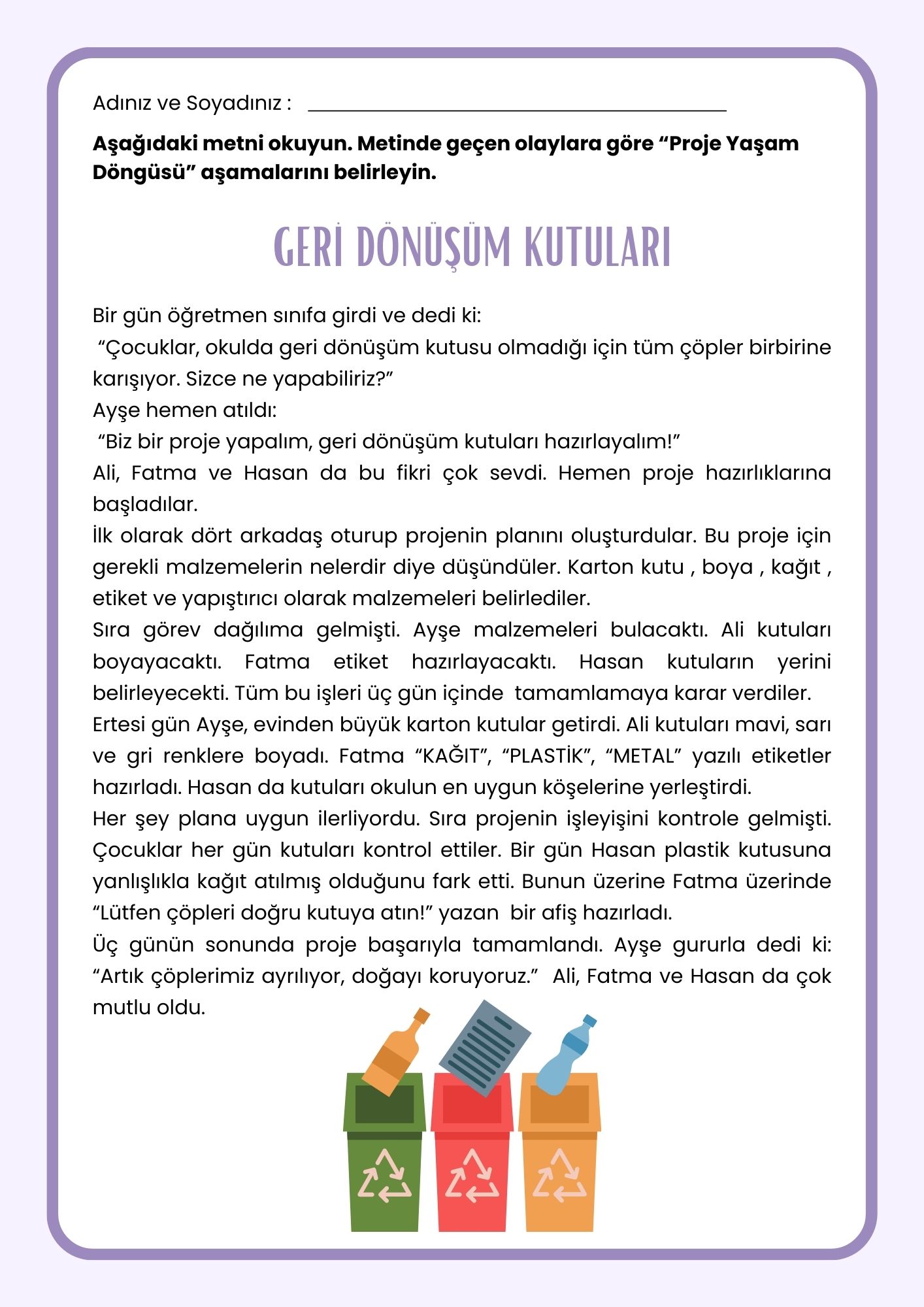 Hadi aşağıdaki çalışma kağıdında yer alan metne göre proje yaşam döngüsünü belirleyelim!