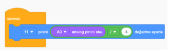 A0 analog piminden okuduğumuz değeri ( 0-1024 Analog değerini) dijital çıkıştan alabileceğimiz 0-255 değerine ayarlamak için 4’e böldük ve 11 nolu PWM pinine bağlı Led’ imize gidecek voltajı ayarladık.