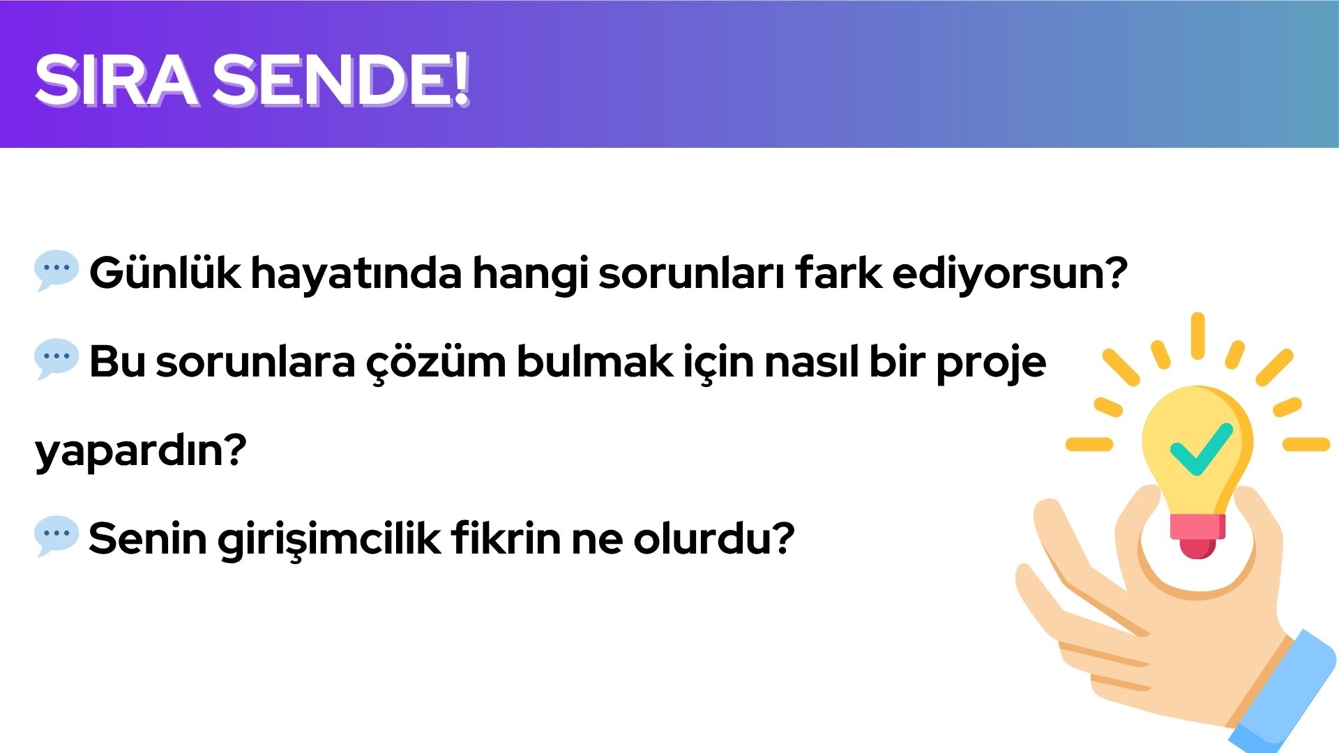 Girişimcilik projelerinin özelliklerini öğrendik. Girişimcilik projeleri örneklerini inceledik. Şimdi sıra sende . Aşağıdaki sorulara cevap ver ve kendi girişimcilik projeni oluştur.