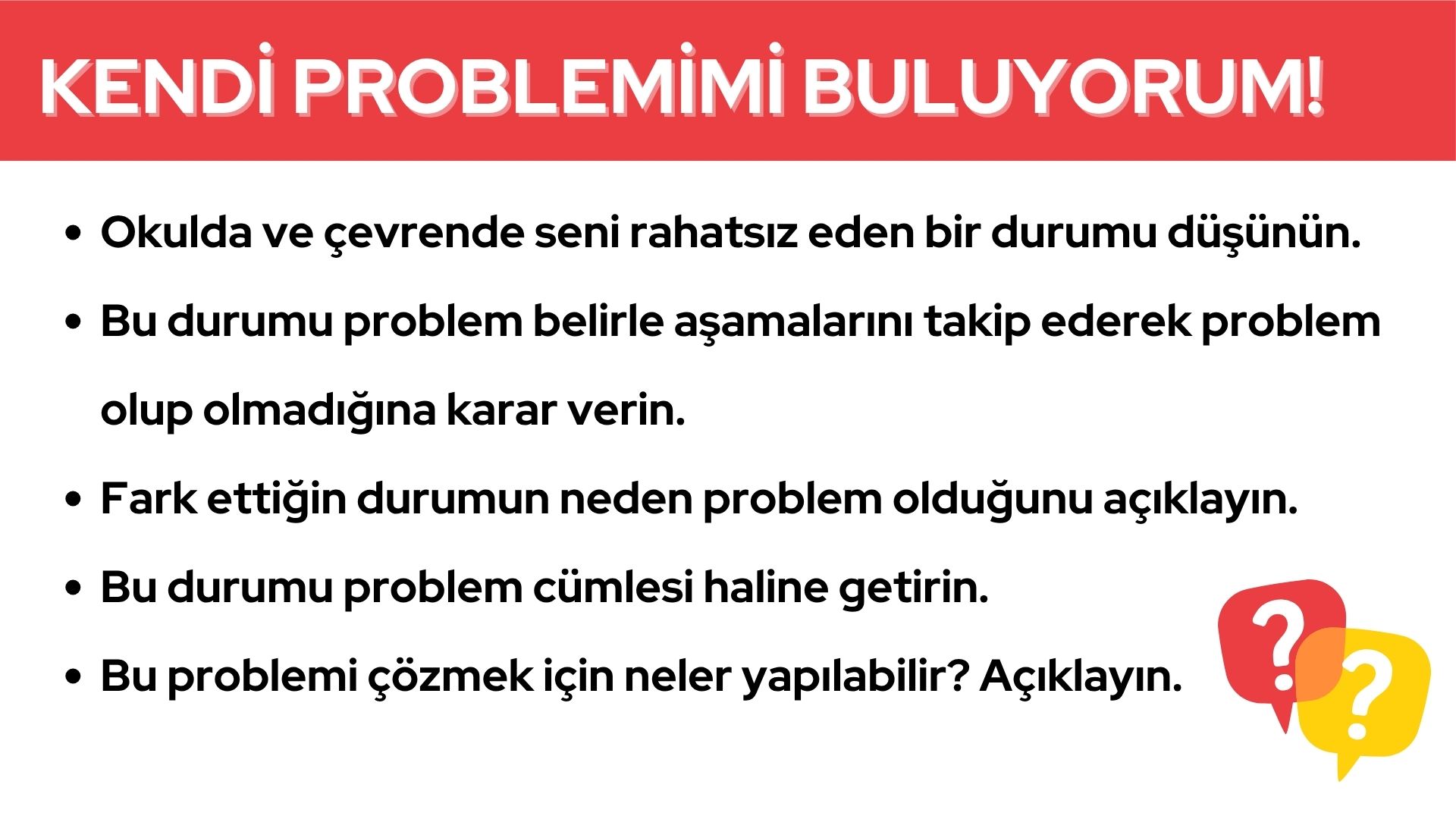 Problem kavramını öğrendiğinize göre artık sıra sizde! Aşağıdaki etkinlik basamaklarındaki soruları bir kağıda cevaplayalım ve kendi problem cümlemizi oluşturalım. Sonra bunu arkadaşlarımızla paylaşalım.