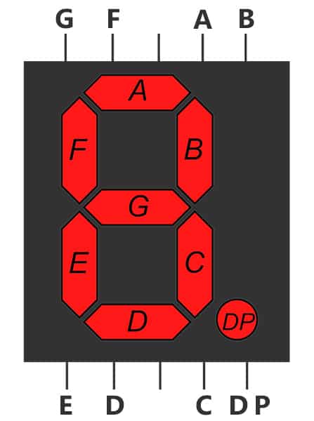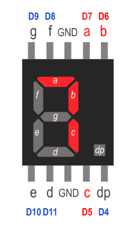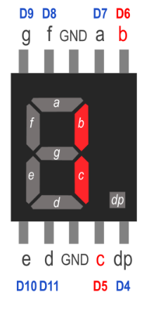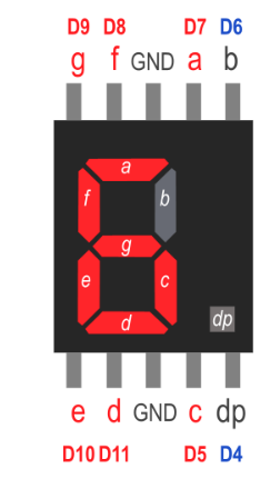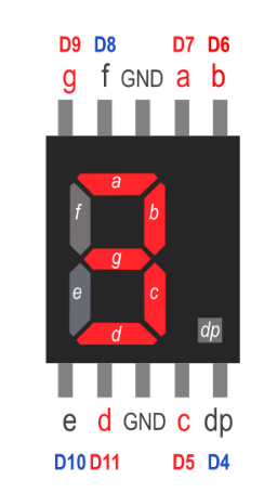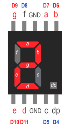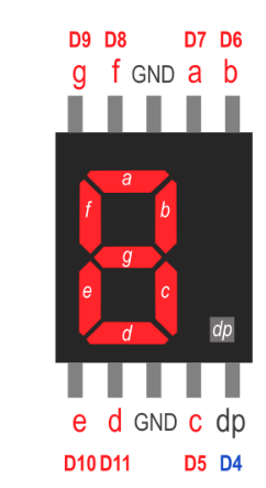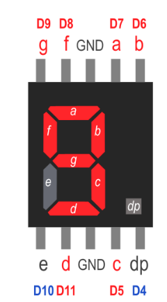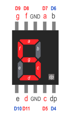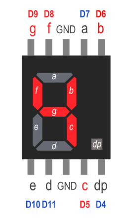 Önde 5 arkada 5 olmak üzere toplam 10 tane bacağı vardır. Bu bacaklardan A-B-C-D-E-F-G-DP olarak isimlendirilenler LED’lere bağlıdır. Bu bacaklar arduino devre kartındaki dijital pinlere bağlanır.