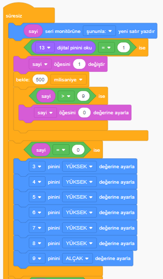 Butonun basılmasını kontrol ettirerek sayi değişkeninin değerini değiştirelim. Sayi değişkenindeki değeri 7 Segmentli Led’e yazdıralım. Bunun için aşağıdaki kodları alt altta yazarak devremizi çalıştıralım.