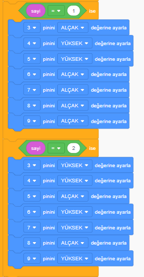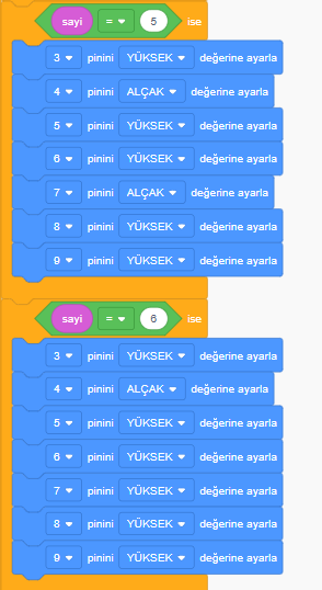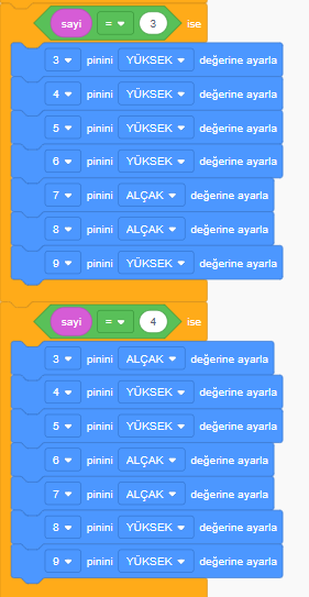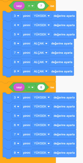 Şimdide kodları yazmaya başlayalım. Dijital rakamlar yazılırken hangi ledlerin yanması hangi ledlerin sönmesi gerektiğini aşağıdaki resimlerden takip edebilirsiniz.