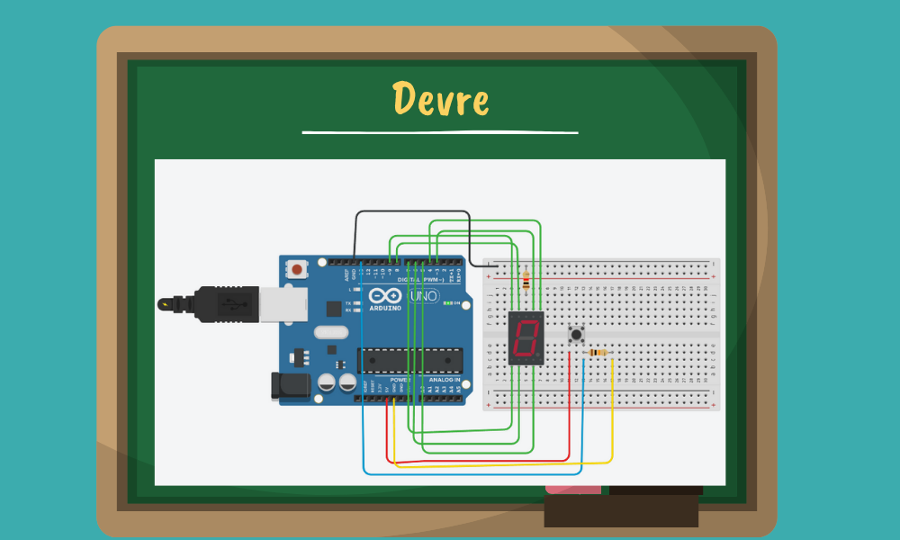 Bu devrede başlangıçta 7 Segmentli LED üzerinde 0 yazacak. Butona bastıkça 7 Segmentli LED üzerinde rakamlar sırasıyla değişecek. Yani butona ilk bastığımızda 1 , ikinci bastığımızda 2 yazacak. 9 rakamından sonra ise tekrar 0 yazacak şekilde bir devre kuracağız.