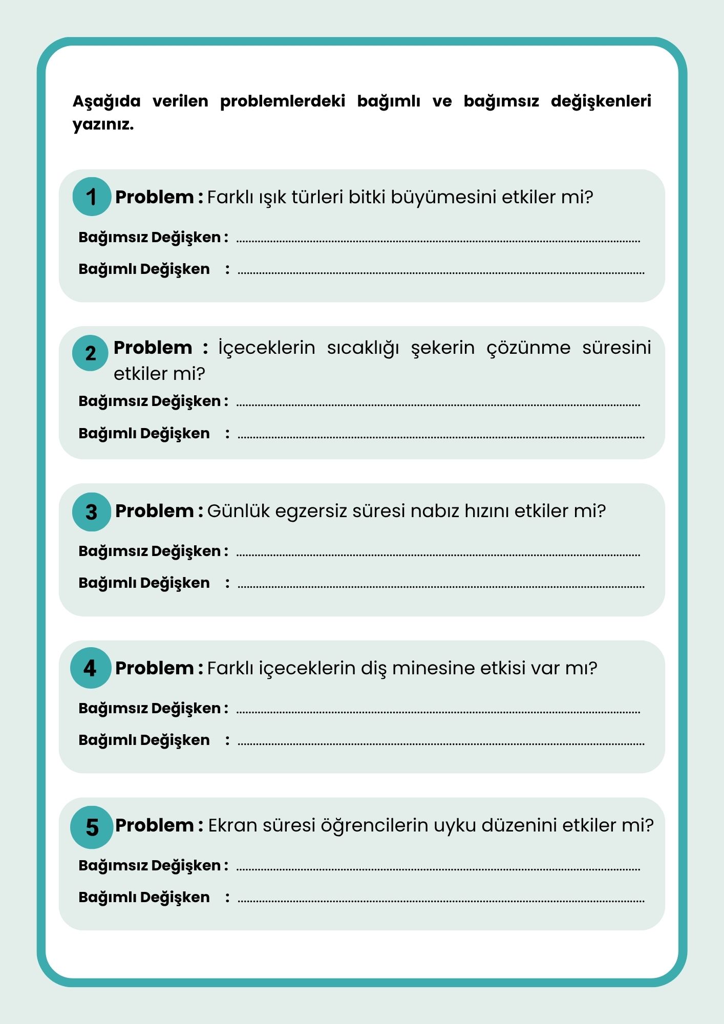 Değişken konusunu öğrendiğimize göre aşağıda verilen problemlerdeki bağımlı ve bağımsız değişkenleri bularak konuyu pekiştirelim.
