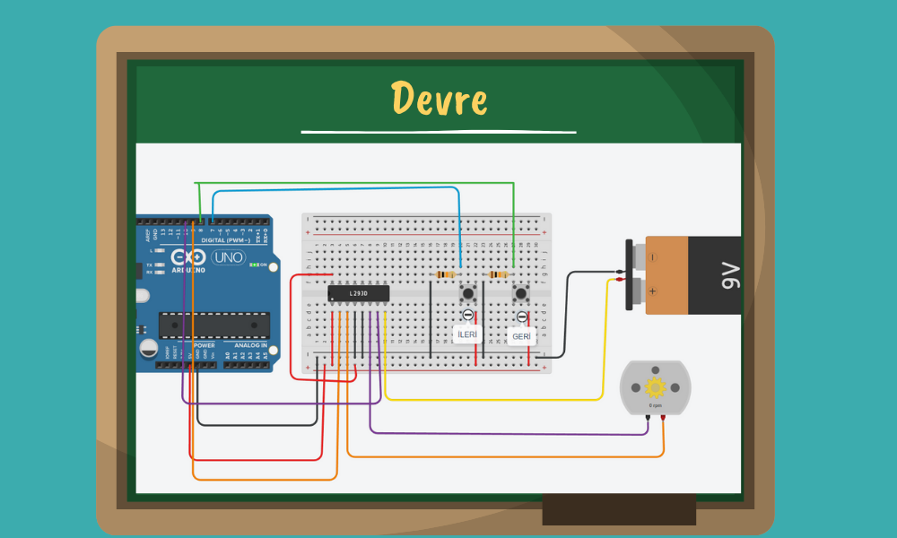 Şimdi de L293D motor sürücüsünü kullanarak DC Motorları buton ile kontrol eden bir devre oluşturalım. Bu devremizde iki tane buton olacak bir butona basınca motor ileri , diğer butona basınca ise geri hareket edecek. Butonlara basılmadığında motor çalışmayacak.
