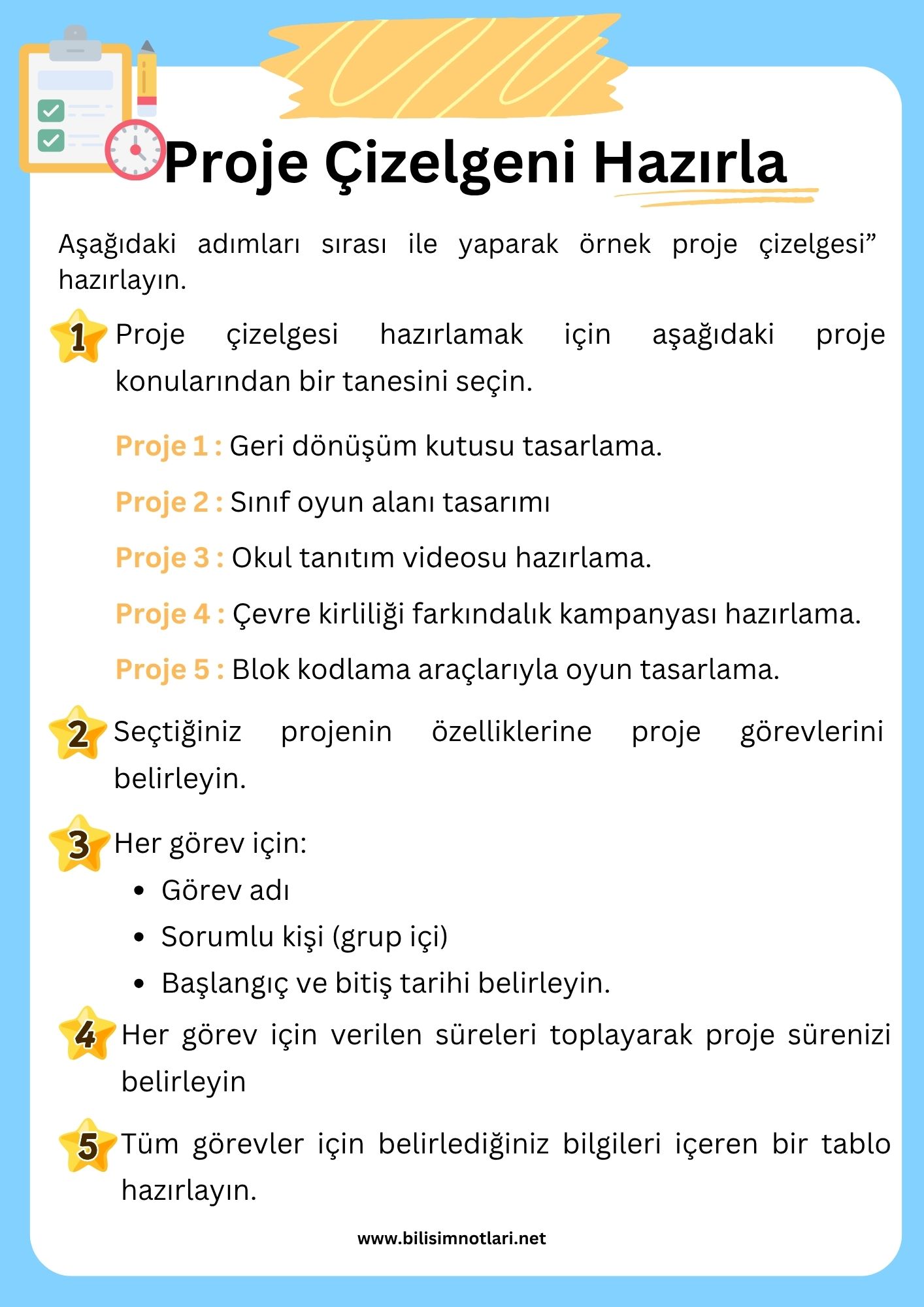 Proje görev çizelgesinin nasıl yapılacağını ve proje süresinin nasıl belirleneceğini öğrendiğimize göre artık sıra sizde. Öğretmenizin belirlediği grup arkadaşlarınızla birlikte aşağıdaki çalışma sayfasındaki basamakları sırasıyla yaparak sizde proje görev çizelgesi oluşturun.