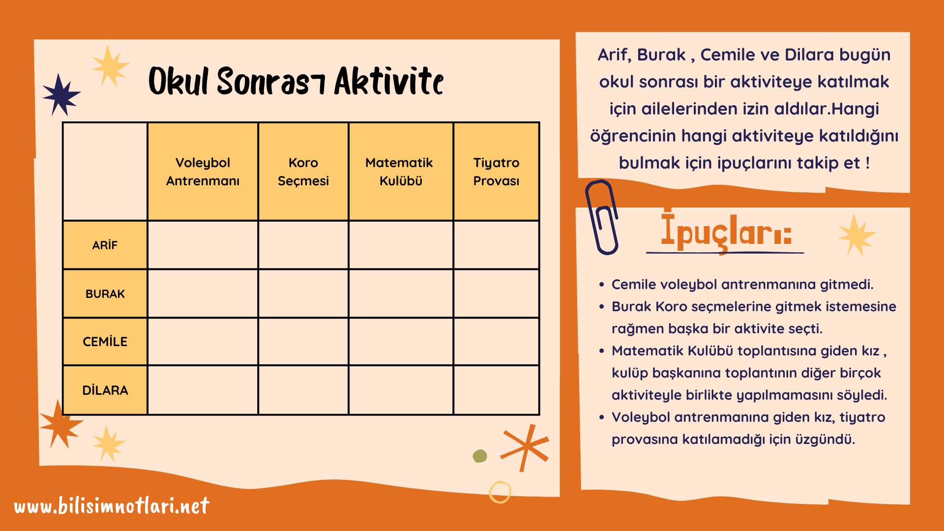 Hadi biraz daha problem çözümü yapalım. Aşağıdaki etkinlikte ipuçları takip edelim ve kimin hangi etkinliğe katıldığını bulalım.
