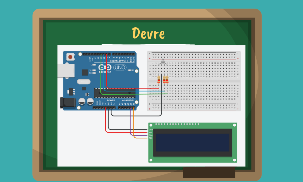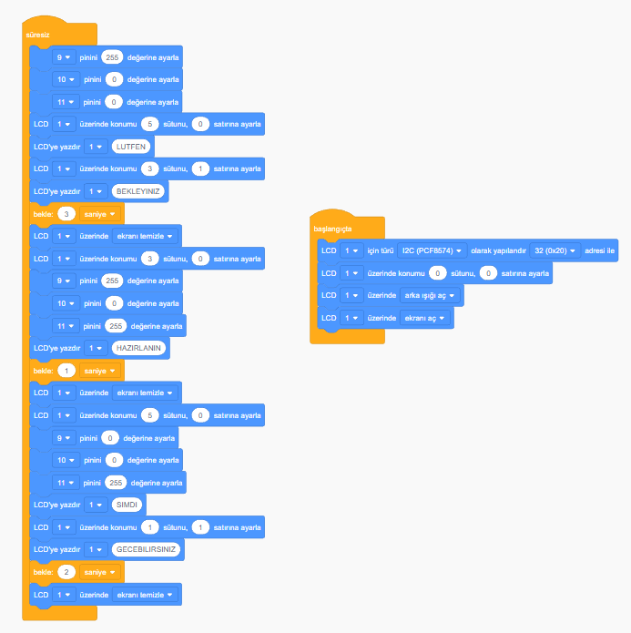Haydi ilk olarak projemizin içeriğinden bahsedelim. Projemizde ilk olarak 3 saniye boyunca “Kırmızı Işık ” yanacak o sırada LCD ekranda ” Lütfen Bekleyiniz.” yazacak. Sonra 1 saniye boyunca “Sarı Işık ” yanacak o sırada LCD ekranda ” Hazırlanın.” yazacak. 3 saniye boyunca “Yeşil Işık ” yanacak o sırada LCD ekranda ” Şimdi Geçebilirsiniz.” yazacak.