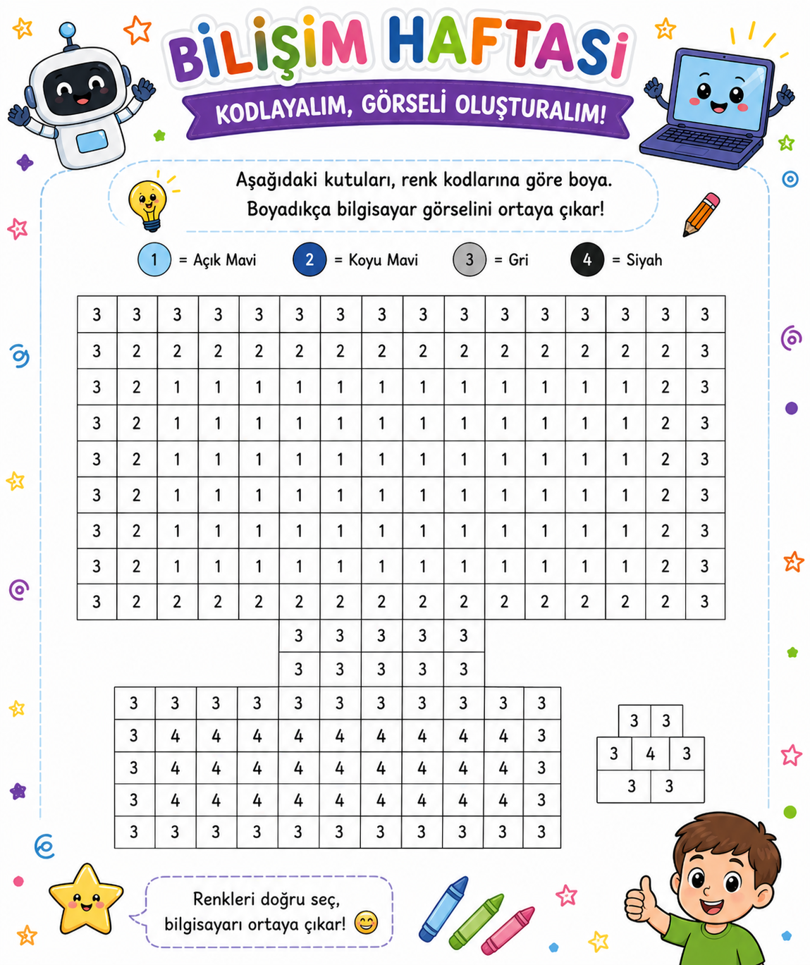 Herkese merhaba. Her sene Mayıs ayının ilk haftası kutladığımız “Bilişim Haftası” için örnek pano dokümanları, izletebileceğiniz video içerikleri, oynatabileceğiniz oyunlar ya da kodlama örnekleri, bilgisayarsız kodlama görsellerini derlediğimiz bu konu umarız sizler için faydalı olur.